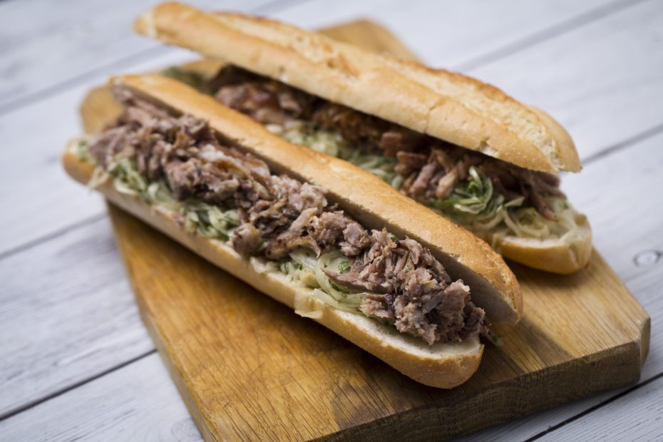 Az oldalast alaposan bedörzsöljük sóval, borssal és köménymaggal együtt összezúzott fokhagymával. A zsírral együtt egy tepsibe tesszük, letakarjuk és 120-130 fokon 3-4 óra alatt puhára sütjük. Félretesszük, még melegen kicsontozzuk és lehűtjük. Egész köményt vízben kiforralunk, majd ezzel a lével öntjük le a vékony csíkokra vágott, sózott és kinyomkodott édeskáposztát és vöröshagymát. Hozzákeverjük a mustárt, esetleg kevés ecetet, némi cukrot. Sózzuk, borsozzuk. A félbevágott baguette-et kevés zsírral megkenjük, beletesszük az ízesített káposztát, az apróra vagdalt hideg sültet és friss petrezselyemmel szórjuk.