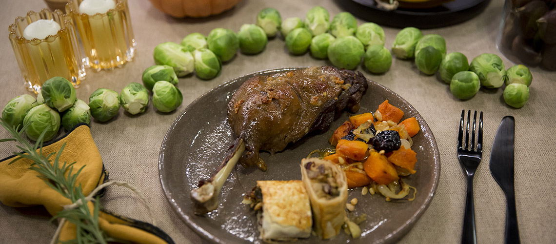 Sült libacomb: Fazékba teszem a besózótt combokat, felöntöm sörrel és vízzel, hogy ellepje a combokat. Beledobom egészben a vöröshagymát, borsot. Fedő alatt, kis lángon addig főzöm, amíg a comb majdnem puha lesz. Bőrrel felfelé sütőpapírral bélelt tepsibe teszem a combokat, rálocsolok 1-2 kanállal a főzőléből, hogy ne ragadjon le. 220 fokos sütőben 15-20 percig sütöm. A kész combokat 1-2 gerszd zúzott fokhagymával átkenem és ropogósra sütöm. Sütőtök aszalt szilvával és fenyőmaggal: a sütőtököt meghámozom, magjait eltávolítom, felkockázom. A hagymát felszeletelem. Serpenyőben olajat hevítek, átpirítom rajta a sütőtököt és tűzálló tálba teszem. A hagymát a sütőtök helyére teszem a serpenyőbe, hozzáadom a cukrot. Karamellizálom a hagymát és a sütőtökre borítom. Sózom, borsozom, rádobom az aszalt szilvát és a fenyőmagot. Letakarva 180 fokon 45 percig sütöm, majd további 45 percet fedő nélkül. Kesudiós kelbimbós rétes: Olajon megdinsztelem a felszeletelt póréhagymát majd hozzáadom az előfőzött kelbimbót és gesztenyét. Borsozom és hozzáadom a kesudiót. Puhára főzöm, majd kihűtöm. Hozzákerverem a zsemlemorzsát és a reszelt füstöltsajtot. A réteslapokat egyenként megkenem olajjal, két lapot használok egy rúdhoz. A tölteléket egyik oldalára halmozom és feltekerem. A tetejét megkenem olajjal és 200 fokon sütöm 30 percig.