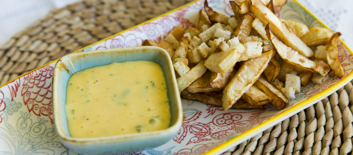 Vágjuk a zellert 8 cm hosszú szálakra, melegítsük fel a sütőolajat. Verjük habosra a tojássárgáját mustárral, citrommal és petrezselyemmel. Sütőben megsütjük a lereszelt száraz kenyeret kis citromhéjjal és fokhagymával. A zellert elősütjük 4 percig 160 fokos olajban. Lecsöpögtetjük, kihűtjük. Másodszor 190 fokon aranyszínűre sütjük. Majonézzel és ropogós zsemlechipsszel és krutonnal megszórva tálaljuk.