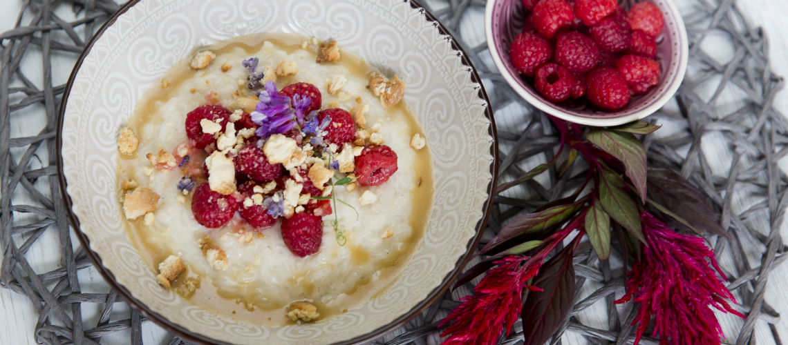 Mossuk meg a rizst, öntsünk rá tejet, főzzük meg, adjunk hozzá vaníliát és cukrot. Ha a rizs puha, hagyjuk állni egy ideig. A málnát citromlében marináljuk, majd hozzáadjuk pirított édesköménymagot. Vajból, lisztből, tejfölből sűrű tésztát gyúrunk, amit a tepsibe törünk majd 180 fokon 15 percet sütjük. Karamellizáljuk a cukrot, tejszínt adunk hozzá, megsózzuk és a kívánt sűrűségre beforraljuk. Vaníliás rizzsel, málnával és a sült morzsával tálaljuk.