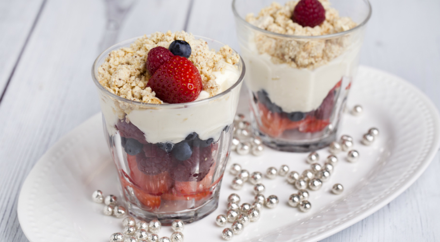 A sajtkrémet a robotgépben habosra keverjük, majd hozzádolgozzuk a sűrített tejet. Belekeverjük a reszelt citromhéjat, a vaníliakivonatot és a joghurtot, végül pedig az előkészített tálkákba töltjük. A tejmorzsát és a gyümölcsöket a behűtött krém tetejére halmozzuk és azonnal tálaljuk.