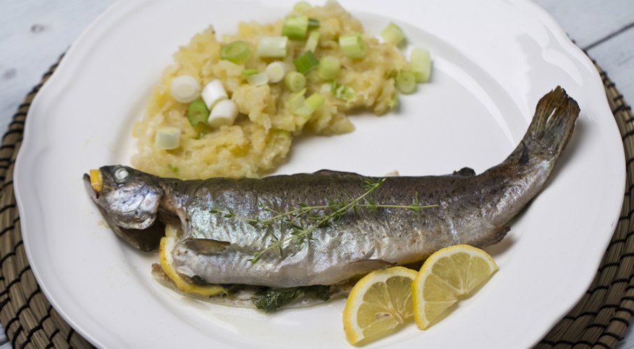 A pisztrángokat megmossuk, kibelezzük, kívül-belül alaposan megszórjuk sóval és köménnyel. A tepsire tesszük a vajszeleteket, majd ráfektetjük a pisztrángokat (így nem fognak csúszkálni). Mindegyik pisztráng belsejébe teszünk 2 szelet vajat, 2 citromkarikát, és friss zöldfűszereket (ízlés szerint petrezselymet, oregánót, citromfüvet és kakukkfüvet). A pisztrángokat meglocsoljuk citromlével és megszórjuk durva szemű tengeri sóval. Végül a pisztrángok szájába teszünk félbe vágott citromkarikákat, és egy ág petrezselymet. 180 °C fokra előmelegített sütőben 15-20 percig sütjük, míg a húsa könnyen leválik a gerincéről.