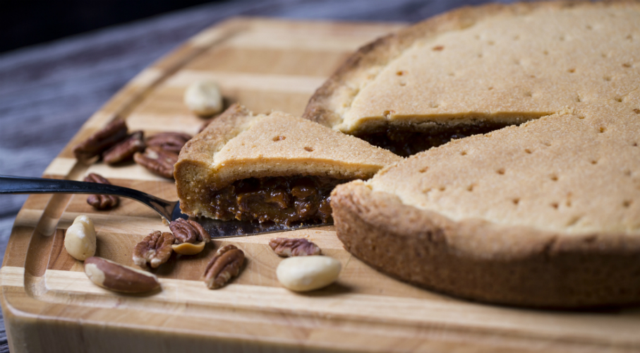 A tészta hozzávalóit összegyúrjuk és 1-2 órát pihentetjük A töltelékhez karamellizálni kezdjük a cukrot, és amikor már világos barna színe van, hozzáadjuk a diót, azzal is pirítjuk, majd felöntjük a tejszínnel. Összeforraljuk, majd a formába terített tésztára öntjük. A maradék tésztából megcsináljuk a pite tetejét, megszurkáljuk villával és 180 fokon aranybarnára sütjük.