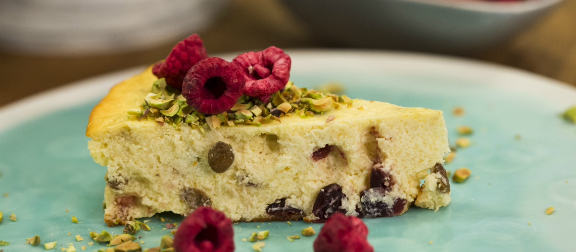 Egy nagy keverőtálba tesszük a krémes túrót. Nem a hagyományos, morzsalékos túrót használjuk, hanem a dobozos, natúr (nem édes) ”túrókrém”, vagy krémes túró nevén kapható változatot. Ha más fajta túróval dolgoznánk, azt át kell passzírozni. A túróhoz adjuk az egész tojásokat, a porcukrot, a tejfölt, 5 dkg olvasztott vajat elektromos kézi habverővel teljesen simára keverjük. Beletesszük a búzadarát, majd 30 percig lefedve hagyjuk állni, ezalatt a gríz kissé megdagad és felszívja a nedvességet. A masszát sóval és a két citrom (lehetőleg kezeletlen) reszelt héjával ízesítjük, majd belekeverjük a mazsolát és az aszalt áfonyát. A maradék 2 dkg olvasztott vajjal kikenünk egy 23 cm átmérőjű tortaformát, majd ebbe öntjük a túrós masszát. 180C fokos sütőben, kb. 45 percig, tűpróbáig sütjük. Langyosan a legfinomabb, de teljesen lehűtve lehet legszebben szeletelni. Házi dzsemmel, lekvárral, gyümölcskompóttal tálaljuk, mellé tejfölt kínálunk.
