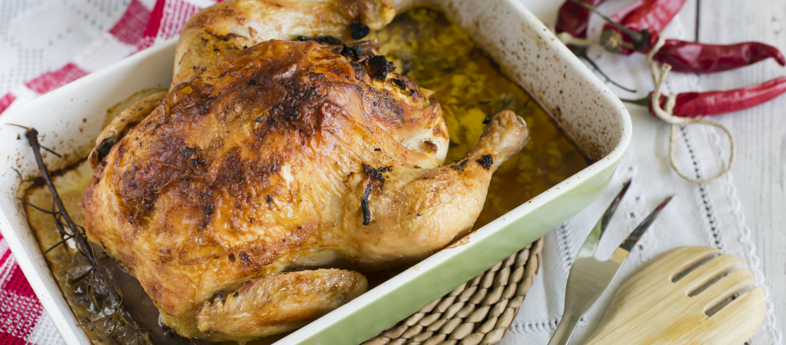 A csirkét alaposan megsózzuk, megborsozzuk, a bőre alatt megkenjük vajjal. Süssük meg szalonnát, és keverjük össze a káposztával, fűszernövényekkel, tojással és pirított kenyérkockákkal. Töltsük meg a csirkét a töltelékkel, kis vizet és vajat tegyünk alá, fedjük le. Süssük 180 fokon körülbelül 50 percig, néha meglocsolva. Ezután öntsük le a levét, készítsünk belőle mártást, miközben a csirkét aranybarnára sütjük. A csirkéhez karalébésalátát készítünk: hasábokra vágjuk, sóval, borssal, snidlinngel ízesítjük, olívaolajjal és citromével marináljuk.