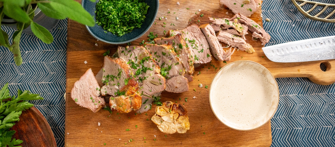 A húst minden oldalán megsózzuk. Egy hegyes késsel kis bemetszéseket ejtünk rajta és megtűzdeljük fokhagyma gerezdekkel.