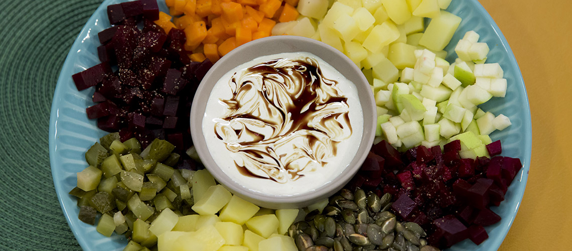 1.Előkészítjük az összes zöldséget, mindent nagyjából egyforma kockákra szeletelünk. A nyers céklát meghámozzuk, kockázzuk. A sült vagy főtt céklát szintén. A krumplit és a sárgarépát meghámozzuk, felkockázzuk, majd külön (de akár ugyanabban a sós vízben), megfőzzük, úgy, hogy puhuljon meg, de maradjon tartása, ne essen szét. Az uborkát és az almát is felszeleteljük, az almát csak közvetlenül bekeverés előtt, hogy ne barnuljon.