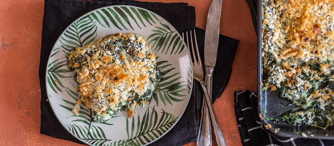 A sütőt 200 fokra előmelegítünk, és egy 9×11 cm-es kerámiaformát kivajazunk. A spenótot egy nagy serpenyőben, 2-3 evőkanálnyi vízzel addig pároljuk fedő alatt, amíg összeesik. Egy szűrőbe szedjük és kinyomkodjuk belőle a felesleges nedvességet.