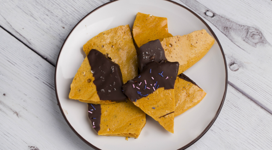 Egy tepsit leterítünk sütőpapírral, amit vékonyan megkenünk olajjal. Egy közepes lábosban, közepes lángon karamellizáljuk a mézet és a cukrot, világos borostyán színűre. Amikor a cukor teljesen felolvadt lehúzzuk a tűzről és belekeverjük a szódabikarbónát. Gyorsan felhabzik, amikor 2-3-szorosára nőtt a karamell volumene, kiöntjük az előkészített tepsire és hagyjuk megszilárdulni (kb. 20 perc). Amikor teljesen megkeményedett, nagyobb darabokra törjük.