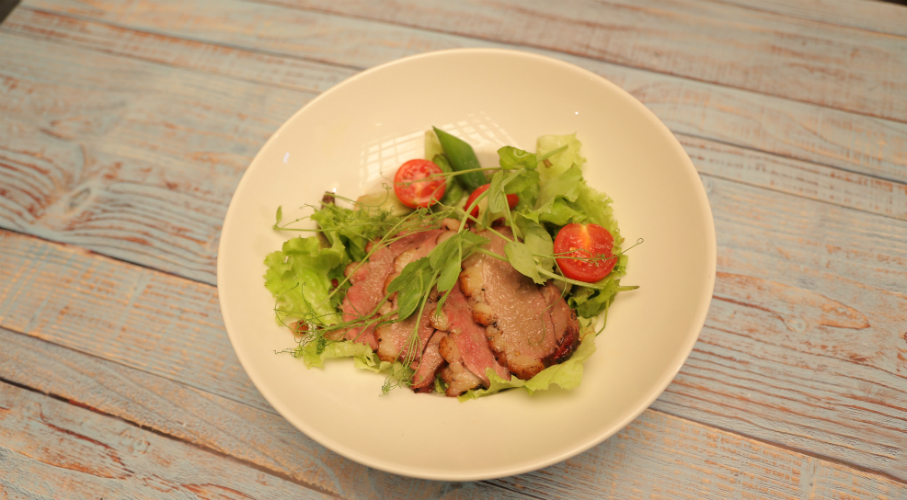 Bors keverékbe keverünk egy kevés csili paprikát ezzel beszórjuk a kacsamellet és 120C fokos smokerba rakjuk bőrével felfelé.