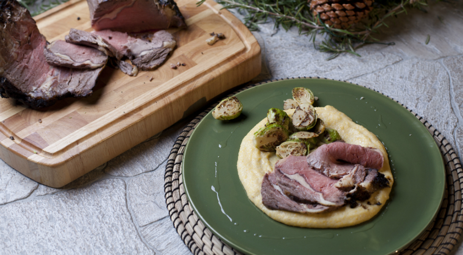 Egy tálban összekeverjük a kávét, a sóval, borssal, a barnacukorral, a cayenne borssal és a vaníliarúd kikapart magjaival. A száraz pácot a húsra kenjük. A csontos oldalával lefelé hőálló edénybe tesszük és 30 percig hagyjuk szobahőmérsékleten pihenni. A sütőt 230 fokra előmelegítjük. A húst a sütőbe tesszük és 15 percig sütjük, majd a hőmérsékletet levesszük 160 fokra és további 1,5-2 órát sütjük. Kivesszük a sütőből és deszkán pihentetjük legalább 20 percig szeletelés előtt. A kelbimbót megmossuk, végeit levágjuk, sérült külső leveleit leszedjük. A bimbókat kettévágjuk, egy serpenyőbe kevés olívaolajat öntünk és rádobjuk a megtisztított kelt. 1 percig pirítjuk, majd hozzáadjuk a szeletelt fokhagymát és újabb 1 percig pirítjuk. Ezután felöntjük a sherryvel vagy a borral és magas lángon tovább főzzük, amíg az alkohol elpárolog. Ekkor hozzákeverjük a magos mustárt, és már csak éppen addig főzzük, amíg összemelegszik a mustárral, közben sózzuk, borsozzuk. A polentához a vizet felforraljuk, sózzuk és megvárjuk, amíg újra felforr. Lassan beleszórjuk a kukoricadarát és 5 percig keverjük közepesen alacsony láng felett. Néha megkeverve addig főzzük, amíg a dara megpuhul és elválik a lábos oldalától. Lehúzzuk a tűzről, hozzákeverjük a puha vajat és a juhtúrót. Tálalásig melegen tartjuk, a tetejére nedves sütőpapírt teszünk, hogy ne bőrösödjön.