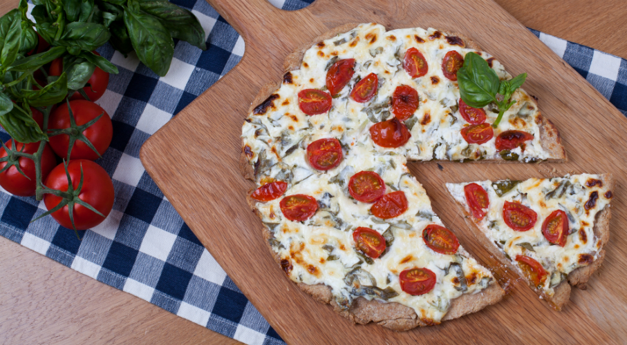A sütőt melegítsük elő 220 fokon. Keverjük el a liszteket egymással, majd a sütőporral, sóval. Adjuk hozzá az olívaolajt és annyi vizet, hogy gyúrható, lágy, de nem ragacsos tésztát kapjunk. Gyúrjuk ruganyossá a tésztát. Osszuk ketté a tésztát. Lisztezett felületen nyújtsuk ki őket vékony lapnak. Helyezzük sütőpapírral bélelt sütőlemezre. Kenjük meg a reszelt sajttal, aprított bazsalikommal, 1 tk. sóval elkevert tejföllel. Helyezzük rá a felezett/negyedelt koktélparadicsomokat, locsoljuk meg kevés olívaolajjal és az előmelegített sütőben süssük 12-15 perc alatt készre. Szórjuk rá frissen a bazsalikomot és tálaljuk.