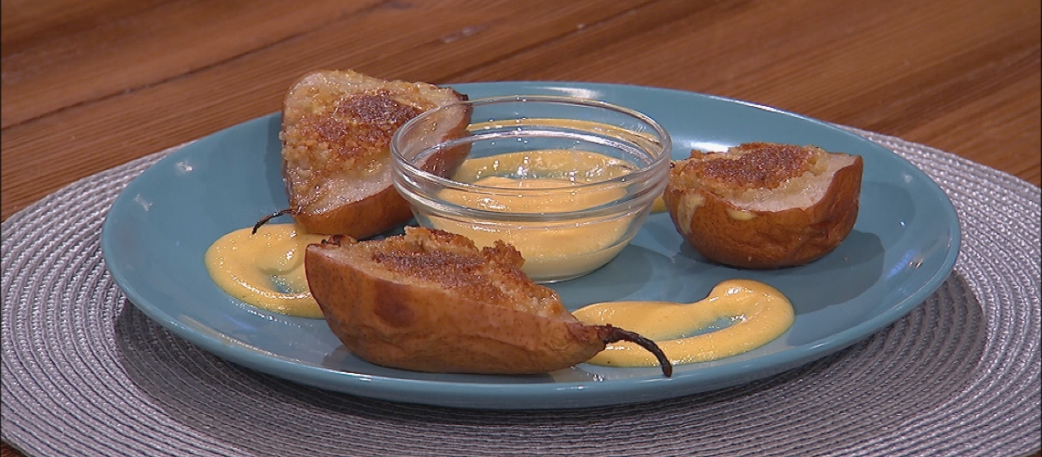 Tálaláskor a zabaglionét a sült körtére kanalazzuk, szépen elrendezzük.