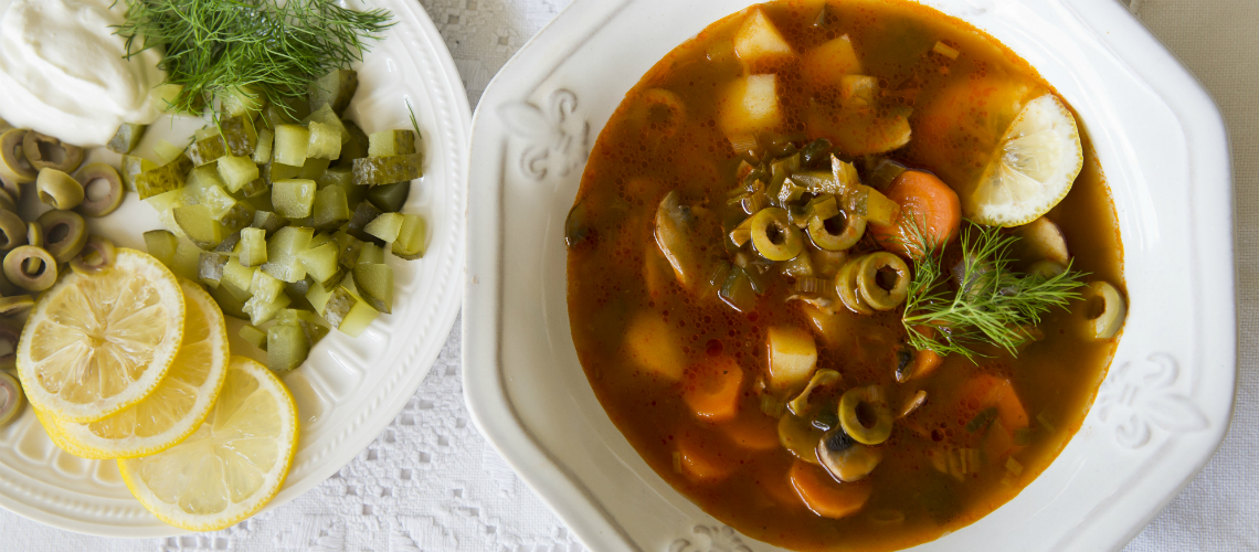 A szárított vargányát leöntjük 8 dl felforralt vízzel, és 30 percig állni hagyjuk. Leszűrjük (a levet megtartjuk), konyhai papírtörlővel kissé leitatjuk, majd kisebb darabokra vágjuk. Felhevítjük az olajat, és üvegesre dinszteljük benne a felkarikázott póréhagymát. Hozzáadjuk a paradicsompürét, és néhány másodpercig pirítjuk, karamellizáljuk. Beletesszük a felkarikázott sárgarépát és a felkockázott burgonyát, átkeverjük, majd felöntjük a vargánya áztatóvizével és még 4 dl vízzel. Sózzuk, borsozuk, hozzáadjuk a felkockázott savanyú uborkát és annak levét, majd kb. 15 percig főzzük, amíg a répa és a krumpli megpuhul. Ekkor tesszük bele a felszeletelt gombát, ezzel már csak további 5 percig főzzük. A legvégén, tálalás előtt tesszük bele a felkarikázott olajbogyót, a vékony karikákra, majd darabokra szeletelt citromot, a finomra aprított kaprot. Tejfölt külön adunk mellé.