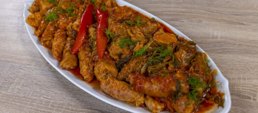 Kapros tépett tészta krumplival, lecsóval és sült oldalassal