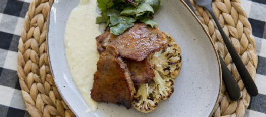 Sült karfiol mézes sertésbordával, salátával