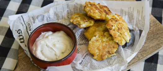 Sült karfiolpogácsák tejfölös mártással