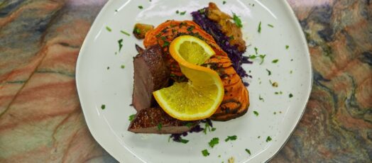 Narancsos kacsamell, legyező édesburgonyával, párolt lilakáposztával