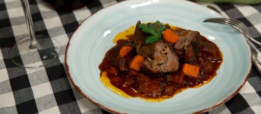 Marhahúsrolád vörösborban, glasszírozott zöldségekkel