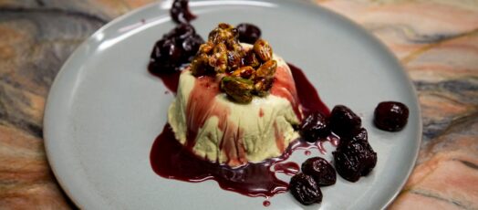 Pisztácia mousse, cseresznye csatnival és pirított pisztáciával