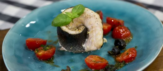 Paradicsomos-kapribogyós tengeri sügér