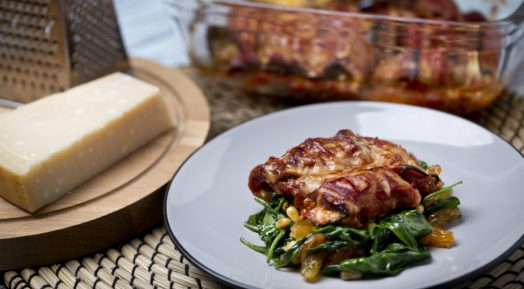 Friss Pirított Spenót Mazsolával, Fenyőmaggal, Darált Húsos Padlizsántekerccsel