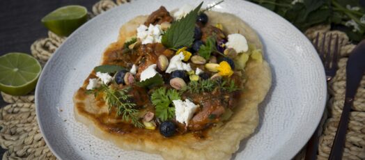 Kelt lángos tépett báránybordával, juhtúróval, marinált áfonyával és erdei gyógynövényekkel