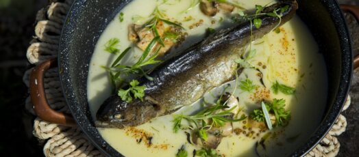 Tűlevélen grillezett pisztráng vajmártással, vízitorma salátával és pácolt tátrai gombával