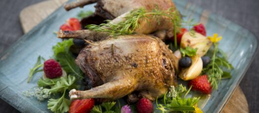Galamb salottahagymával és erdei gyümölcsökkel
